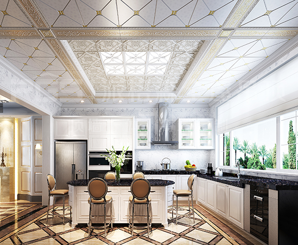 餐廚合并這種布置就餐時上菜快速簡便,能充分利用空間,較為實(shí)用。要盡量使廚房和餐室有自然的隔斷或使餐桌布置遠(yuǎn)離廚具,餐桌上方應(yīng)設(shè)集中照明燈具。通過頂面或地面進(jìn)行區(qū)域劃分,案例中就是直接通過兩種顏色的條扣吊頂將廚房與餐廳劃分,使得空間顯得明亮開闊。